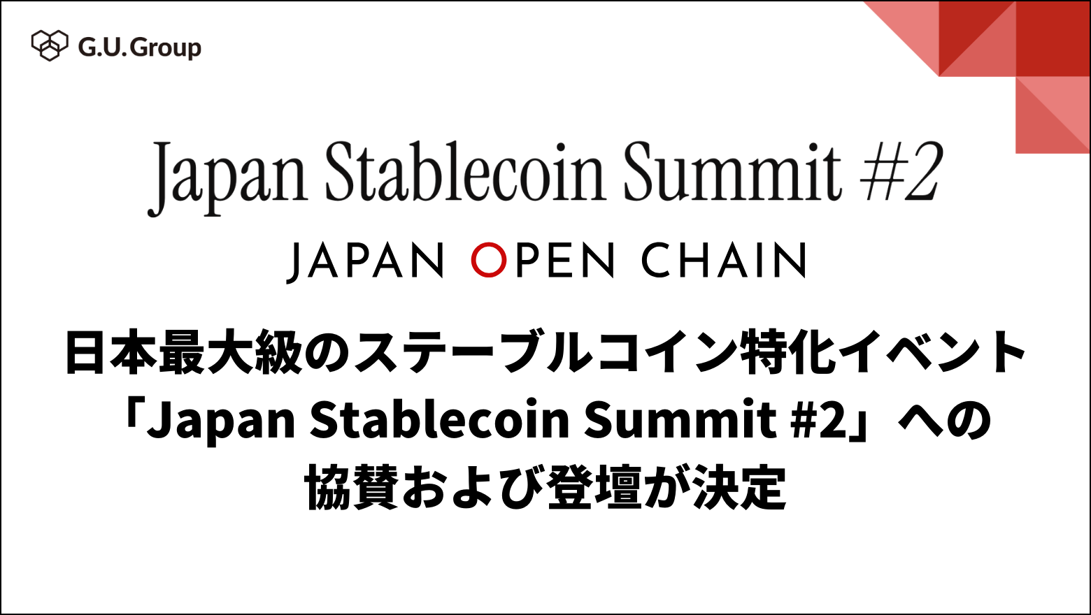 web3 ソリューションを提供する G.U. Group 株式会社(本社:東京都渋谷区、代表取締役:近藤 秀和、稲葉 大明、以下「当社」)は、2月3日(火)に開催される「Japan Stablecoin Summit #2」への協賛ならびにJapan Open Chainファウンダー 近藤 秀和のパネルディスカッション登壇をお知らせします。